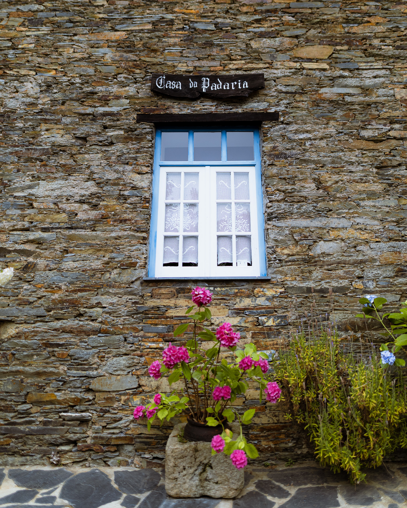 Entre as paredes de negro xisto protegidas por telhados de luzentes escamas repara nos detalhes e tons azuis das janelas de todas as casa.